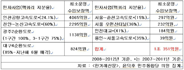 인천공항고속도로(맥쿼리인프라 지분율 24.1%)의 손실보전액은 4065억원, 천안~논산고속도로(60%)는 2295억원, 광주2순환도로(1구간 100%, 3-1구간 75%) 1138억원, 대구4순환도로(85%-지난해 6월 매각) 824억원, 마창대교(70%) 477억원, 서울지하철9호선(24.5%) 424억원, 부산 수정산터널(100%) 375억원, 서울~춘천고속도로(15%) 297억원, 서울 우면산터널(36%) 232억원, 인천대교(41%) 184억원, 용인~서울고속도로(35%) 39억원이다. 총 1조 351억원이다.