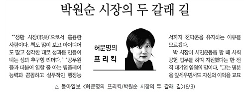 · 동아일보 <허문명의 프리킥/박원순 시장의 두 갈래 길>(6/3, 35면, 허문명 논설위원, http://me2.do/G3br2XLW)