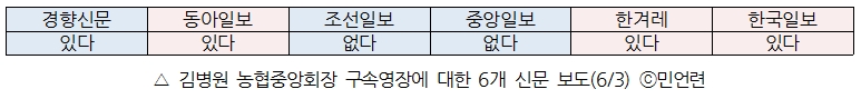 김병원 농협중앙회장 구속영장 청구, 경향․조선․중앙 미보도