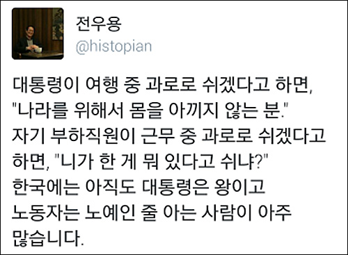 전우용 역사학자는 “대통령이 여행 중 과로로 쉬겠다고 하면, ‘나라를 위해서 몸을 아끼지 않는 분’, 자기 부하직원이 근무 중 과로로 쉬겠다고 하면, ‘니가 한 게 뭐 있다고 쉬냐?’”라는 일부 반응을 지적했다. 이어 전 학자는 “한국에는 아직도 대통령은 왕이고 노동자는 노예인 줄 아는 사람이 아주 많습니다”라고 꼬집었다.