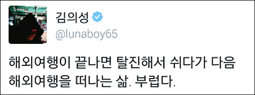 배우 김의성씨는 “해외여행이 끝나면 탈진해서 쉬다가 다음 해외여행을 떠나는 삶. 부럽다”라고 힐난했다.
