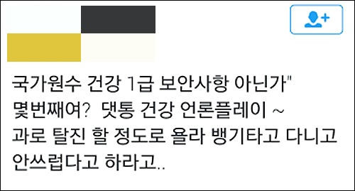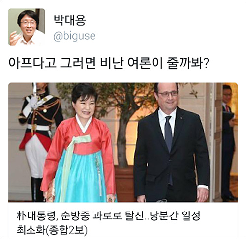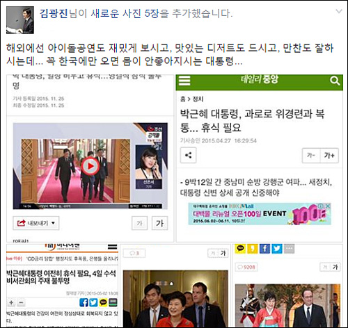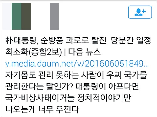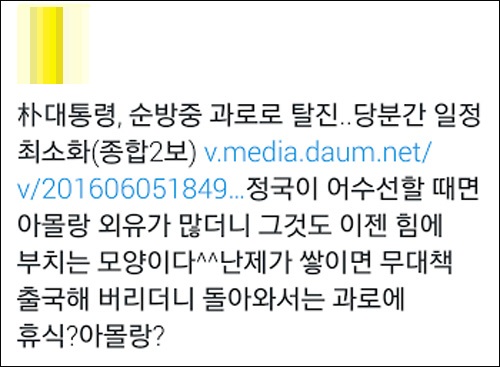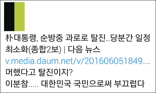 SNS에서는 “그렇게 힘든다면 나가지 말지, 대체 뭘 한다고 돌아다니시나”, “대통령이 아픈 것 자체도 국가기밀이 될 수 있다. 몸이 안 좋으면 적당히 눈치껏 쉬어”, “국익에 도움도 안되는 헛일하고 있으면서 뭐하는 건지”, “청문회법 거부한 거 물타기하느라 애쓴다”, “놀러 다니면서 힘들다 그러면 우리 같은 사람들은 뭐냐?”, “국가기간 통신사가 국가원수가 편찮다는 소식을 아주 깨알같이 전달한다”, “난제 쌓이면 무대책 출국하더니 돌아와서는 과로에 휴식? 나 몰라라?” 등의 의견들이 이어졌다.