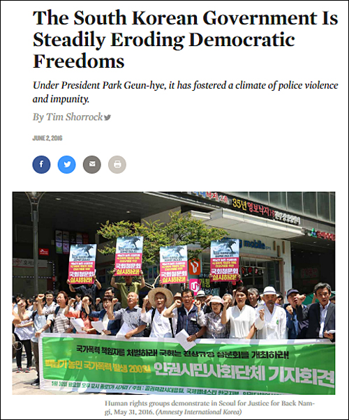 무리한 경찰 폭력의 행사와 더불어 시위를 기획한 노조 지도자를 감금하는 등 한국에서 “공공 표현과 반대를 위한 공간이 줄어 들고 있다”는 국제 앰네스티 한국 지부장의 말을 전하며 지난 1월 서울을 방문한 유엔 보고관 역시 박근혜 정부 하에서 “평화로운 집회 및 결사의 자유가 점진적으로 후퇴”하고 있으며, “법원마저도 최근에는 인권을 확대하기보다는 제약하는 방향으로 기울고 있다”고 우려를 표했다고 기사는 말했다.