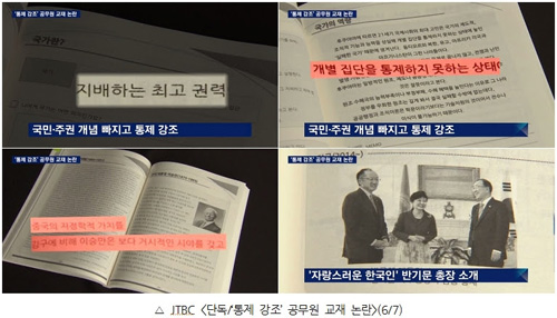 JTBC <단독/‘통제 강조’ 공무원 교재 논란>(4번째, 정해성 기자, http://me2.do/xUr7Er2L), <‘국민 주권’ 언급 없이…>(5번째, 임진택 기자, http://me2.do/xcrcuPPj)