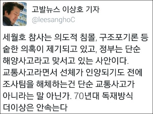 이상호 기자는 또 “세월호 참사는 의도적 침몰, 구조포기론 등 숱한 의혹이 제기되고 있고, 정부는 단순 해양사고라고 맞서고 있는 사안”이라며 “교통사고라면서 선체가 인양되기도 전에 조사팀을 해체하는 건 단순 교통사고가 아니라는 말 아닌가. 70년대 독재방식 더 이상은 안 속는다”고 일갈했다.