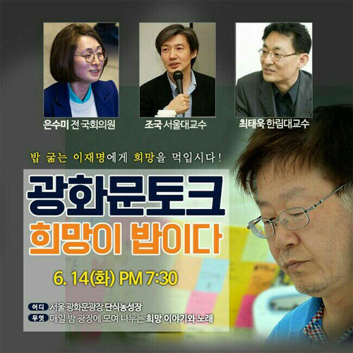 각계 인사가 참여하는 ‘희망이 밥이다’ 토크콘서트도 13일 저녁 7시30분부터 시작됐다. 첫날은 소설가 서해성 성공회대 교수와 이상호 고발뉴스 이상호 기자, 유종일 KDI 국제정책대학원 교수가 참여해 시민들과 지방자치와 시국 현안에 대해 이야기를 나눴다. 14일 저녁에는 은수미 전 더민주 의원, 조국 서울대 법학전문대학원 교수, 최태욱 한림대 교수가 시민들과 만날 예정이다.