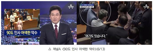 이어진 <90도 인사 어색한 악수>는 더 황당하다. “여당의원들의 중앙통로 사수로 박 대통령은 마치 새누리당길을 걷는 듯” “야당 의원들은 박수를 치지 않기도 했지만, 야당의 피켓 시위가 있었던 작년과 비교하면 예의를 갖춘 모습” “국민의당 김수민 의원은 90도 인사” 등 대통령을 맞이하는 의원들의 모습을 마치 ‘풍속도’처럼 묘사했다.