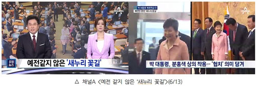 오히려 채널A는 대통령을 찬양하는 보도를 내놨다. 먼저 <예전 같지 않은 ‘새누리 꽃길’>는 제목과 김설혜 앵커의 멘트에서 '새누리 꽃길'이라는 표현을 사용했다. 예전 같지 않다는 점을 강조하기 했지만, 대통령이 입장할 때 새누리당 의원들이 도열해서 박수를 치는 모습을 ‘새누리 꽃길’ 이라 칭한 것 자체가 우스꽝스러운 대목이다. 보도는 리포트를 시작하자마자 대통령의 분홍색 옷차림을 보여주더니 “분홍색 상의를 입고 국회를 찾은 박근혜 대통령. 지난달 13일 여야 3당 원내지도부를 만났을 때와 같은색 옷”이라며 이를 “일명 ‘전투복’으로 불리는 감색이나 붉은색과 달리 협치의 의지를 담은 선택”이라고 해석했다. 기자는 “이어진 여야 지도부와의 간담회에서도 일일이 협조를 요청하며 고개를 숙이는 모습도 연출”했다고 평한 뒤, 박 대통령이 “국회와 더 많이 대화하고 소통해나갈 예정인데 여러분께서도 많이 도와주시기를 부탁드리겠습니다”라고 말한 장면을 녹취 인용했다. 이어 기자는 “여소야대 정국을 의식한 듯 한결 부드러워진 모습. 국회 심판론을 언급하며 '레이저'를 쏘던 모습도 찾아볼 수 없습니다”라며 “임기 국정과제 마무리에 대한 의지”라고 찬사를 덧붙였다.