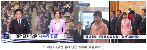 방송 가운데서 박수 소식에 가장 집착한 매체는 종편방송 채널A였다. 다른 방송은 박수 소식과 함께 개원 연설 내용이 무엇이었는지도 전했지만 채널A <종합뉴스>만은 이날 국회 분위기만을, 그것도 연예뉴스와 같이 가십성으로 다뤘다. 박수를 몇 번이나 쳤는지 누가 어떻게 쳤는지 외에도 대통령의 옷차림, 대통령을 맞이하는 새누리당 의원들의 ‘꽃길’, 대통령과 악수한 의원에 대해 상세히 보도했다.