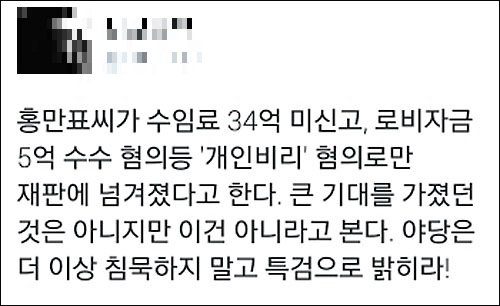 또 “현재 서울중앙지검에서 구속된 피의자들이 수감되는 서울구치소가 아닌 상대적으로 시설이 좋은 서울남부구치소에 수감된 사실이 알려지면서 이마저도 전관예우가 아닌가 하는 의혹이 이는 상황”이라고 비판했다.