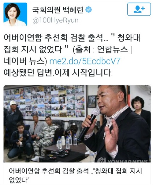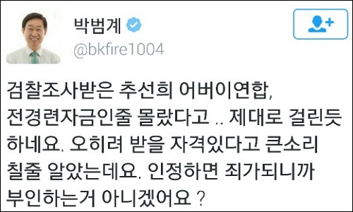 추선희 사무총장의 이 같은 주장에 대해 더불어민주당의 ‘어버이연합 진상조사 TF’ 간사를 맡고 있는 박범계 의원은 “검찰 조사 받은 추선희 어버이연합, 전경련 자금인줄 몰랐다고.. 제대로 걸린듯 하네요”라며 “오히려 받을 자격 있다고 큰소리 칠 줄 알았는데요. 인정하면 죄가 되니까 부인하는 거아니겠냐”고 꼬집었다.