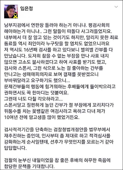 아울러 임 검사는 “검찰의 눈부신 내일이었을 참 좋은 후배의 허무한 죽음에 합당한 문책을 기대한다”고 촉구했다.
