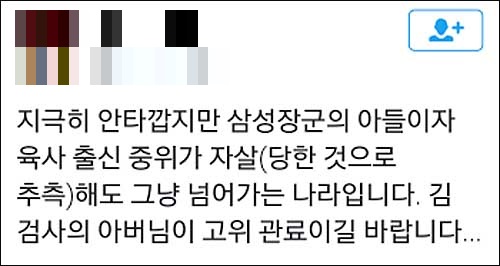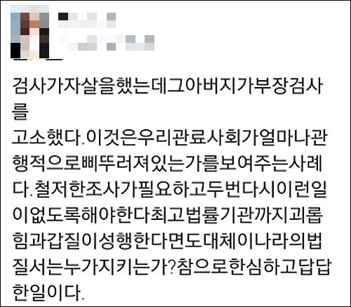 해당 내용에 SNS에서는 “대한민국 검찰의 한 단면을 보여주는 사건입니다. 검찰 개혁해야 합니다”, “이쯤되면 합법을 빙자한 조폭이라 말해도 과언이 아닌 썩은 조직”, “누구나 약자이고 피해자가 될 수 있다. 내부의 개선의지가 크길 바랄 뿐이다”, “부장검사의 갑질은 누구나 다 알고 있죠. 젊고 유능한 인재를 잃어버림에 마음이 아픕니다. 철저한 진상규명 있으면 좋겠지만 제대로 될려는지요. 검사들 욕만 했는데 이런 억압이 많군요”, “정말 검찰개혁은 필요가 아닌 필수인 것 같습니다”, “검찰개혁을 제대로 하지 않으면 이 나라의 장래는 가망이 없습니다”, “검사의 죽음! 등 사회 곳곳의 자살사건은 분명 우리 사회가 뭔가 잘못 되어가고 있다는 증거다”, “검사가 자살을 했는데 그 아버지가 부장검사를 고소했다. 이것은 우리 관료사회가 얼마나 관행적으로 삐뚤어져 있는가를 보여주는 사례, 철저한 조사가 필요하다” 등의 의견들이 이어졌다.