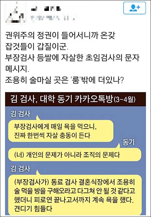 <중앙>이 사망한 김 검사의 대학 친구, 법조계 동료들로부터 전달받은 생전 카카오톡 메시지에 따르면 사망한 김 검사는 “부장검사에게 매일 욕을 먹으니 한번씩 자살 충동이 든다. 술자리에서 내내 닦였다”고 고충을 토로했다.