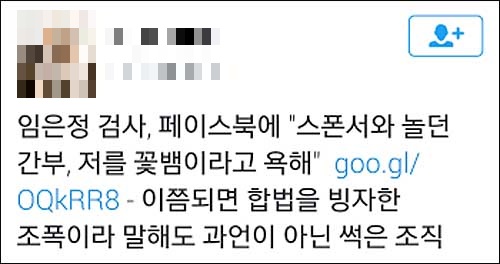 임 검사는 이날 페이스북에서 “스폰서 달고 질펀하게 놀던 간부가 절 부장에게 꼬리치다가 뒤통수를 치는 꽃뱀같은 여검사라고 욕하고 다녀 제가 10여년 전에 맘고생을 많이 했었거든요”라면서 이같이 토로했다.