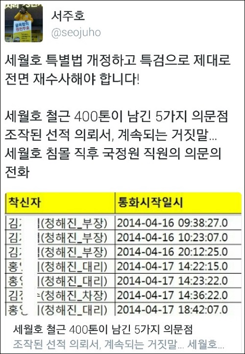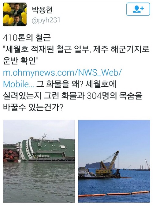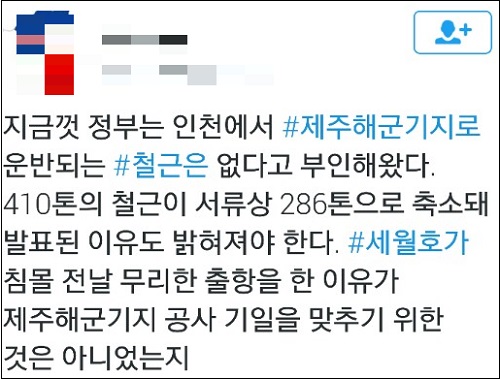 한편, 이에 앞서 <미디어오늘>은 세월호 침몰 당일 제주해군기지로 향하는 철근 410톤이 세월호에 선적된 사실을 단독 보도한 바 있다. <관련기사 ☞ 세월호에 제주해군기지行 철근 400톤 선적.. “무리한 출항 이유?”>