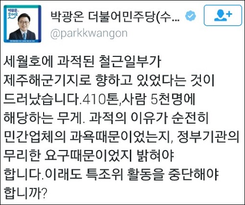 이 같은 사실이 확인되자, 더불어민주당 박광온 의원은 트위터를 통해 “세월호에 과적된 철근 일부가 제주해군기지로 향하고 있었다는 것이 드러났다”며 “410톤, 사람 5천명에 해당하는 무게. 과적의 이유가 순전히 민간업체의 과욕 때문이었는지, 정부기관의 무리한 요구 때문이었는지 밝혀야 한다”고 강조했다.