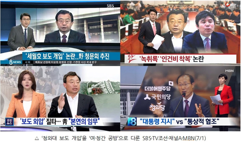 심지어 TV조선은 <‘녹취록’ ‘인건비 착복’ 논란>(7/1)에서 ‘청와대 보도 개입’을 현대원 미래전략수석의 연구 인건비 착복 의혹과 함께 다루기도 했다. MBN에서만 “야당의 공격에 청와대 인사들이 종일 석연찮은 해명만 내놓으면서 세월호 보도 개입 논란은 사그라지지 않고 있습니다”라며 이원종 비서실장 해명이 ‘석연치 않다’는 언급이 있었다.