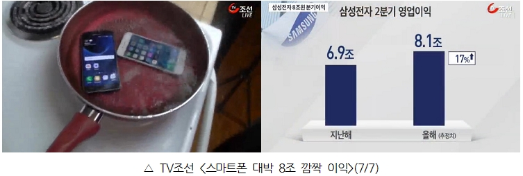 타사 보도들은 MBC와 판에 박힌 듯 똑같지만 TV조선은 정말 이해할 수 없는 수준까지 나아간다. TV조선 <스마트폰 대박 8조 깜짝 이익>(30번째, 김수홍 기자, http://me2.do/FD5082Ub)은 리포트를 시작하자마자 삼성 갤럭시S7의 광고 영상을 보여주며 “펄펄 끓는 물에 빠뜨려도, 16시간 동안 물에 담궈도, 멀쩡하게 작동”한다고 노골적인 상품 홍보를 했다. 이후 보도는 MBC와 비슷하다. MBN의 경우, 유일하게 “삼성전자가 2분기 잠정실적을 발표”했다며 보도의 출처를 밝혔으나 홍보성 태도는 똑같았다. 심지어 “저조한 실적을 기록하고 있는 애플은 아이폰7으로 갤럭시S7의 질주를 막는다는 복안”이라며 삼성전자와 애플사의 경쟁 구도를 부각한 보도까지 더해 총 2건을 보도했다.