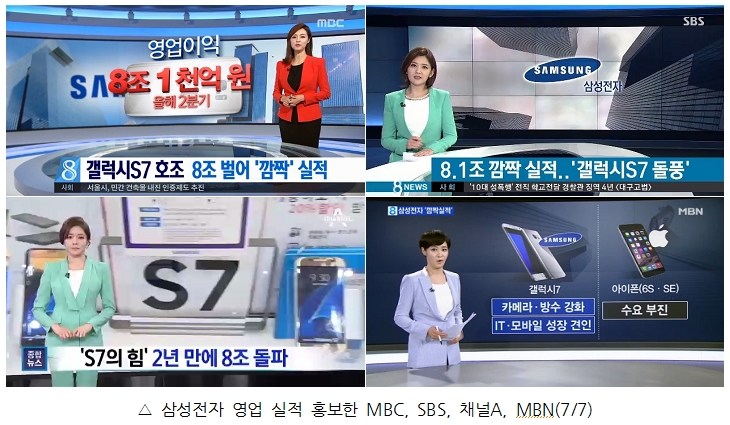 JTBC를 제외한 6개 방송사가 모두 삼성전자의 영업실적 호조를 선전했다. 7일, 사실상 삼성전자 광고나 마찬가지인 보도들이 쏟아졌다. MBC <갤럭시 S7 호조 8조 벌어 ‘깜짝’ 실적>(6번째, 조현용 기자, http://me2.do/FmKcsLDb)가 대표적이다. MBC는 삼성전자 휴대폰 갤럭시 S7의 판매실적 상승을, 상당히 앞 순서에 해당하는 6번째 보도로 배치했다. MBC가 이 사안을 중대하게 다뤘다는 의미이다. 타사의 경우 KBS 22번째(단신), SBS 22번째, TV조선 30번째, 채널A 22번째, MBN 23~24번째 등 뉴스 후반부에 배치했다. MBC 보도 내용은 “삼성전자가 9분기 만에 8조 원대 영업이익을 회복”해서 “매출 50조 원에 영업이익 8조 1천억 원”을 달성했고 여기에는 “2천 6백만대 넘게 팔리면서 모바일 부문에서만 4조 원 이상 영업 이익”을 발생시킨 갤럭시 S7이 큰 역할을 했다는 것이다. 여기에 “초고화질TV와 에어컨 등의 선전”도 덧붙였다. 사실상 삼성전자 제품에 대한 선전에 가깝다.