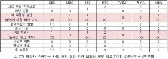 KBS가 연일 국방부 입장만 대변하며 사드 배치를 강력히 옹호하고 있지만 타사의 보도 역시 비슷한 수준이다. 보도량과 수위에서 KBS가 두드러질 뿐이다.