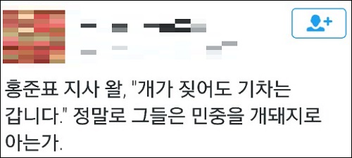 그런가하면 페이스북 이용자 이모씨는 “홍준표 지사는 결국 야당 도의원과, 주민투표에 서명한 다수의 도민을 개로 규정 하는구나”라면서 “나향욱 개돼지와 홍준표의 쓰레기와 개가 다른게 뭔가?”라고 개탄했다.