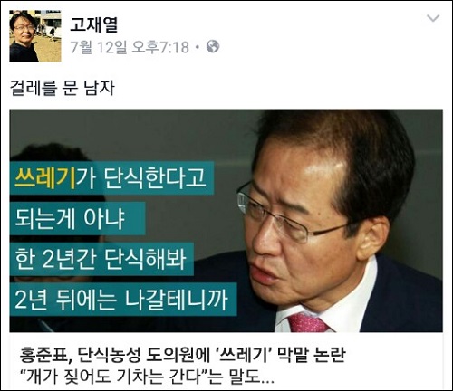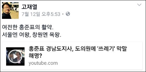 <시사인> 고재열 기자는 페이스북에 홍 지사의 ‘막말 동영상’을 공유하며 “걸레를 문 남자”, “여전한 홍준표의 활약. 서울에 여왕, 창원엔 욕왕” 이라고 힐난했다.
