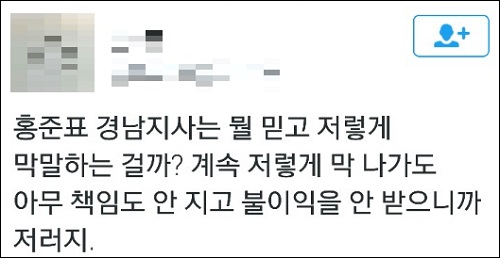 또 다른 이용자 고모씨는 “나향욱 발언의 파장이 사그라들기도 전에 홍준표 경남도지사의 막말이 또 다시 문제를 일으키고 있다”며 “도대체 이와 같은 말을 내뱉을 수 있는 바닥에는 무엇이 깔려있는 것이냐”고 질타했다.