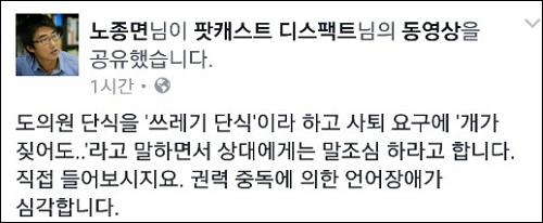 노종면 전 YTN노조위원장은 “도의원 단식을 ‘스레기 단식’이라 하고 사퇴 요구에 ‘개가 짖어도..’라고 말하면서 상대에게는 말조심 하라고 한다”며 “권력 중독에 의한 언어장애가 심각하다”고 일갈했다.