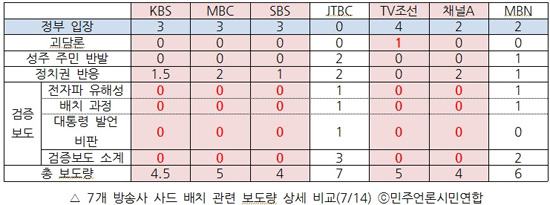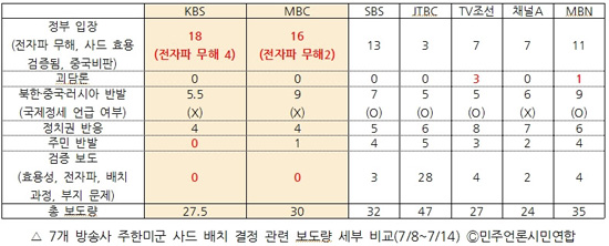 민언련은 사드 배치가 발표된 7월 8일부터 14일까지 일주일 간, 방송사들의 사드 관련 보도량을 주제별로 집계했다. 그 결과 KBS와 MBC의 편파성은 경악할 만한 수준이었다. KBS는 전체 27.5건 중 무려 18건(65.5%)에서 정부와 국방부의 입장만 받아썼다. MBC도 비슷한 수준으로서 전체 30건 중 절반을 상회하는 16건이 정부 입장 보도였다. 여기에는 북한 핵위협 방어 등 사드의 효용성을 선전하는 보도, 성주 배치에 대한 비판으로 제기된 수도권 방어 불가에 대한 해명, 사드 배치에 반발하는 중국에 대한 비판 등 국방부 입장이 모두 포함되어 있다.