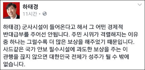 하 의원은 17일 자신의 페이스북을 통해 “군사시설이 들어온다고 해서 그 어떤 경제적 반대급부를 주어선 안 된다”며 “주민 시위가 격렬해지는 이유 중 하나는 그럴수록 더 많은 보상을 해주었기 때문”이라고 강변했다.