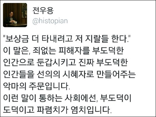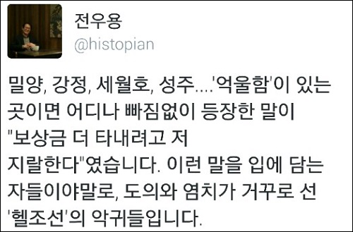 이와 관련 역사학자 전우용 씨는 “밀양, 강정, 세월호, 성주.. ‘억울함’이 있는 곳이면 어디나 빠짐없이 등장한 말이 ‘보상금 더 타내려고 저 지랄한다’였다”며 “이런 말을 입에 담는 자들이야말로, 도의와 염치가 거꾸로 선 ‘헬조선’의 악귀들”이라고 강하게 비판했다.