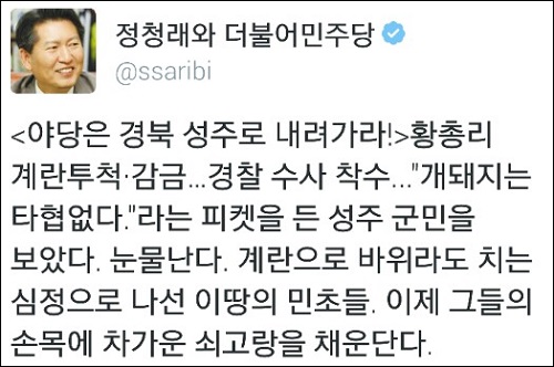 경찰이 엄중 처벌을 예고하며 신속 수사에 나서자 정청래 더불어민주당 전 의원은 SNS를 통해 “‘개돼지는 타협없다’라는 피켓을 든 성주 군민을 보았다. 눈물 난다. 계란으로 바위라도 치는 심정으로 나선 이 땅의 민초들. 이제 그들의 손목에 차가운 쇠고랑을 채운단다”라며 야당을 향해 “경북 성주로 내려가라”고 촉구했다.