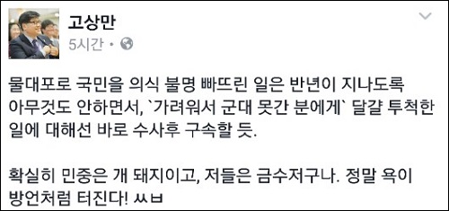 인권운동가 고상만 씨는 “물대포로 국민을 의식 불명에 빠뜨린 일은 반년이 지나도록 아무것도 안하면서, ‘가려워서 군대 못간 분에게’ 달걀 투척한 일에 대해선 바로 수사 후 구속할 듯”이라며 “확실히 민중은 개돼지이고, 저들은 금수저구나. 정말 욕이 방언처럼 터진다”고 개탄했다.