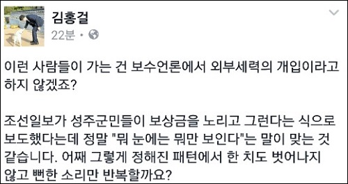 더불어민주당 김홍걸 국민통합위원장도 “조선일보가 성주군민들이 보상금을 노리고 그런다는 식으로 보도했다는데 정말 ‘뭐 눈에는 뭐만 보인다’는 말이 맞는 것 같다”며 “어째 그렇게 정해진 패턴에서 한 치도 벗어나지 않고 뻔한 소리만 반복할까요”라고 힐난했다.