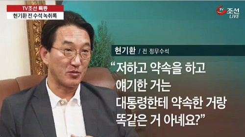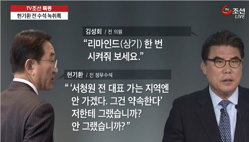 현 전 수석은 “저하고 약속을 하고 얘기한 거는 대통령한테 약속한 거랑 똑같은 거 아녜요? 다시 원점으로 돌아가면 얼마나 복잡해지는 지 압니까?”라며 서 의원의 지역에 출마하지 않겠다던 자신과의 약속을 왜 지키지 않느냐고 불만을 쏟아냈다.