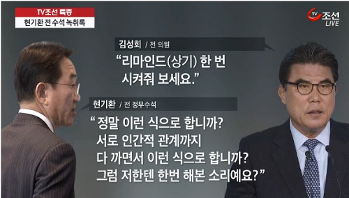 김 전 의원이 약속 내용에 대해 “리마인드 한 번 시켜줘 보세요”라며 재차 확인을 요구하자, 현 전 수석은 “정말 이런 식으로 합니까? 서로 인간적 관계까지 다 까면서 이런 식으로 합니까? 그럼 저한텐 한번 해본 소리예요? ‘서청원 전 대표 가는 지역엔 안가겠다. 그건 약속한다.’ 저한테 그랬습니까? 안 그랬습니까?”라고 화를 내기도 했다.