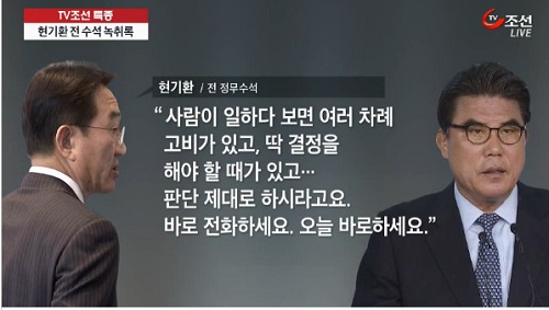 또 좀 더 생각할 시간을 달라고 하자, 현 전 수석은 “사람이 일하다 보면 여러 차례 고비가 있고 딱 결정을 해야 할 때가 있고, 판단 제대로 하시라고요. 바로 전화하세요. 오늘 바로 하세요”라며 강하게 압박했다.