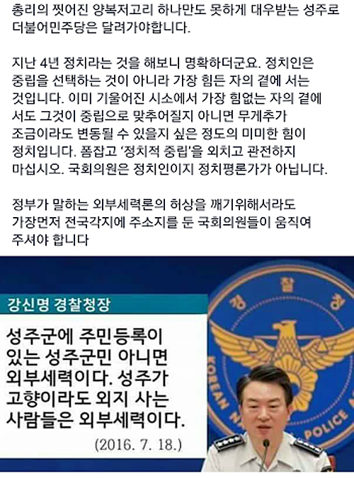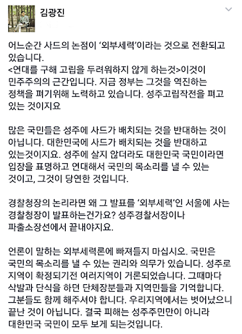 김광진 전 더불어민주당 의원은 20일 페이스북에서 “경찰청장의 논리라면 왜 그 발표를 ‘외부세력’인 서울에 사는 경찰청장이 발표하는 건가요”라며 “성주경찰서장이나 파출소장선에서 끝내야지요”라고 꼬집었다.