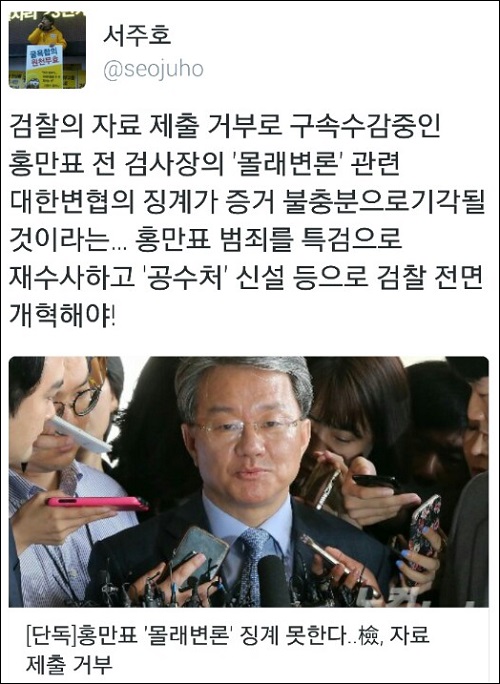 검찰이 홍만표 변호사 ‘몰래 변론’ 혐의와 관련한 자료를 대한변호사협회(이하 대한변협)에 넘기지 않아, 홍 변호사에 대한 징계 신청이 기각된 것으로 알려졌다.