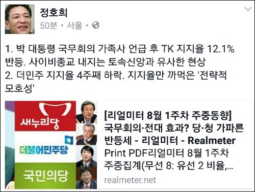 <리얼미터>는 박 대통령 지지율 급반등은 지난 2일 국무회의에서 가족사를 직접 언급한 것이 ‘배수의 진’으로 해석되며 여론의 주목을 불러일으켰고, 1일 창원에서 열린 영남권 합동토론회부터 본격화된 여당 당권 경쟁의 가열이 핵심 지지층의 재결집으로 이어진 데 따른 것으로 풀이했다.
