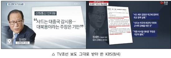 KBS는 TV조선의 3일 보도를 바로 다음날인 4일, 그대로 받아썼다. KBS <‘사드 반대’ 중 매체 기고…여 고강도 비판>은 “김대중 노무현 정부 때의 인사들이 잇따라 중국 공산당 기관지 등의 매체에 사드반대 기고와 인터뷰를 해서 정치권에서 논란”이라며 TV조선의 논리를 따랐다. “사드배치에 반대하는 더민주 일부의원들은, 중국의 의견을 듣겠다며 방중을 계획”한 사실도 함께 “논란”으로 지목했다. 리포트에서 기자는 “김대중 정부 시절 통일부 장관을 지낸 정세현 전 장관” “노무현 정부 청와대 비서관을 지낸 김충환 씨” 등이 중국 관영매체에서 사드 배치를 비판하고 있다며 이에 대한 새누리당의 비판도 덧붙였다. KBS가 타깃으로 삼은 인물도 정세현 전 장관과 김충환 씨로서 TV조선과 동일하다.