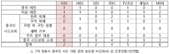 반면 KBS는 중국과 야권에 대한 비판은 빼놓지 않았다. 사드 반대 목소리를 ‘중국 편’ ‘비(非)애국’ ‘중국 편’으로 매도하려는 의도가 엿보인다. 이런 태도는 MBC에서도 비슷하게 나타났지만 MBC는 4일, 중국의 한류 제재와 무역 제재를 묶어 1건의 보도를 냈다. 중국 비판과 사드를 비판하는 인사를 ‘중국 편’으로 모는 보도에서 독보적인 행보를 보이고 있는 TV조선도 중국의 사드 보복을 3건 보도했다.