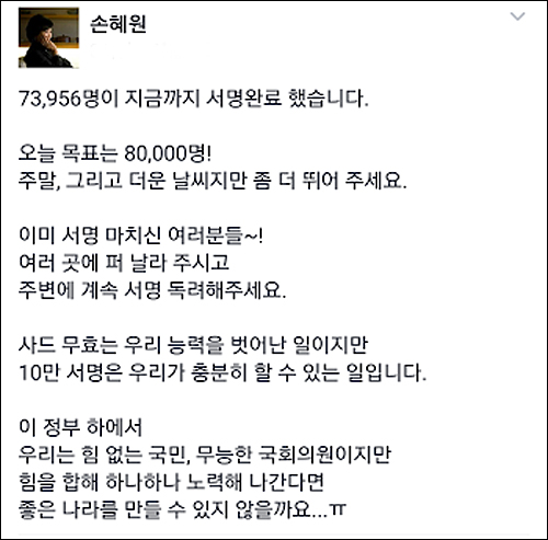 한편 지난 3일 경북 성주군민들과의 간담회에서 “사드배치 철회 요구 백악관 서명 10만명 달성”을 약속했던 손 의원은 페이스북에 매일 서명 현황을 올리고 있다.