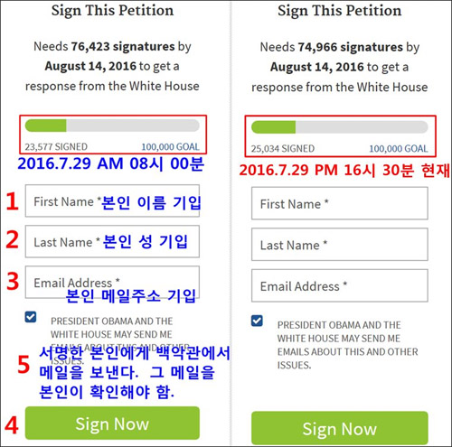 지난달 15일부터 미국 백악관 홈페이지 청원 사이트 ‘WE THE PEOPLE’에서 진행되고 있는 한반도 사드 배치 철회 서명운동에는 6일 낮 12시 30분 현재 7만4805명이 참여했다. 청원 한달 시점인 오는 14일까지 10만여명을 달성하면 백악관은 60일 내에 공식 답변을 해야 한다.