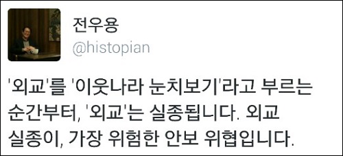 전씨는 또 “‘외교’를 ‘이웃나라 눈치보기’라고 부르는 순간부터, ‘외교’는 실종된다”고 지적, “외교 실종이, 가장 위험한 안보 위협”이라고 거듭 강조했다.