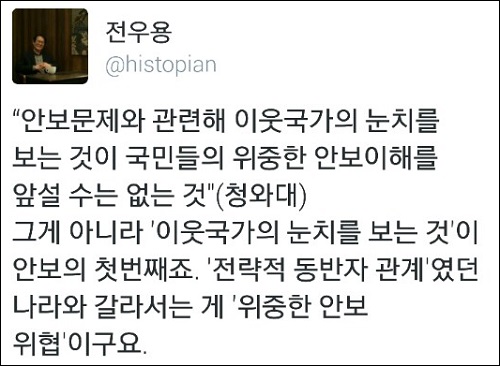 청와대의 이 같은 반응에 역사학자 전우용 씨는 8일 트위터를 통해 “‘이웃국가의 눈치를 보는 것’이 안보의 첫 번째”라고 강조하며 “‘전략적 동반자 관계’였던 나라와 갈라서는 게 ‘위중한 안보 위협’”이라고 비판했다.