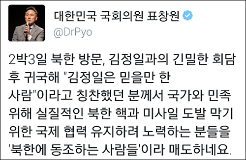 표창원 “방북때 김정일 칭찬했던 분이 野 의원외교 매도”