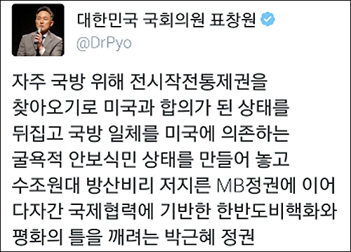 이어 그런 대통령이 “국가와 민족 위해 실질적인 북한 핵과 미사일 도발 막기 위한 국제 협력 유지하려 노력하는 분들을 ‘북한에 동조하는 사람들’이라 매도하네요”라고 비난했다.