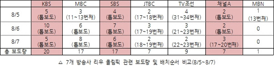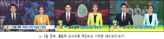KBS와 SBS는 개막식이 열리기도 전인 5일부터 리우 올림픽 관련 보도를 저녁종합뉴스의 톱보도로 배치하며 <스포츠뉴스>를 방불케 했다. 3일간 올림픽 관련 총 보도량도 각 20건, 17건으로 10건을 넘기지 못한 타사를 압도했다. 개막식 풍경과 종목별 일정 및 메달 예상까지, 보도 내용은 스포츠 뉴스 그 자체였다. MBC도 비록 5일 톱 보도를 내진 않았지만 6~7일 톱 보도와 함께 총 17건의 보도를 올림픽에 할애하며 비슷한 태도를 보였다. 지상파 3사는 저녁종합뉴스 직후 스포츠 뉴스가 따로 편성되어 있음에도 불구하고 굳이 올림픽 보도를 메인뉴스의 톱보도로 장식한 것이다. 다만 SBS의 경우 6일에는 메인뉴스 후 스포츠 뉴스를 따로 방송하지 않았다.